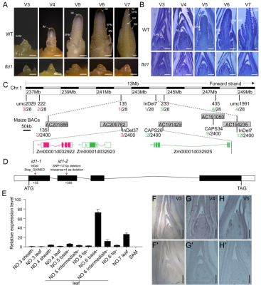 1、生殖转换突变体的鉴定与基因克隆:对田间发现的一个无生殖生长的自然突变体ftd1进行通过图位克隆和互补验证,证实ID1基因功能丧失是导致ftd1无法完成生殖转化的关键原因(图1)。