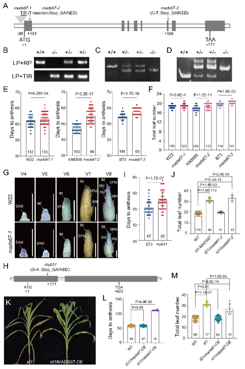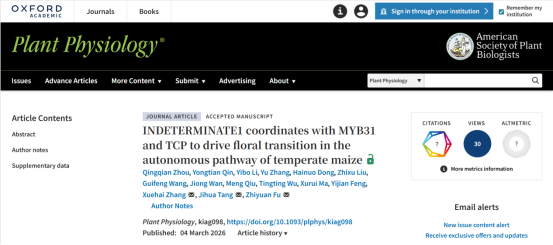近日,Plant Physiology 杂志在线发表了由汤继华/付志远团队撰写的题为“INDETERMINATE1 coordinates with MYB31 and TCP to drive floral transition in the autonomous pathway of temperate maize”的研究论文。该研究通过对开花转变缺陷突变体(ftd1)的精细定位与功能研究,首次揭示ID1通过双路径模块调控玉米开花时间的分子机制。