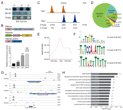 2、ID1下游靶基因的筛选鉴定:亚细胞定位发现ID1定位于细胞核,转录激活实验表明ID1具有转录激活性,能够特异结合GTC核心基序,并直接激活MADS67等关键开花基因的表达。为了系统解析ID1的调控网络,研究团队结合RNA-seq和DAP-seq联合分析,发现ID1在未成熟叶片中调控大量与器官发育和信号转导相关的基因,如MADS67、SBP20(SPL家族转录因子)等(图2)。