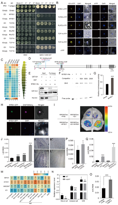 3、ID1协同因子的鉴定与验证:鉴于ID1的表达局限于幼嫩的叶片基部且无明确的可移动能力,筛选了ID1的潜在辅助因子。酵母双杂交、BiFC和Pull-down实验验证MYB31和TCP14/16/20是ID1的互作蛋白。双荧光素酶实验显示,ID1与MYB31或TCP20共表达时,对MADS67的激活效果显著增强,揭示ID1互作蛋白与ID1能协同激活下游靶基因(图3)。